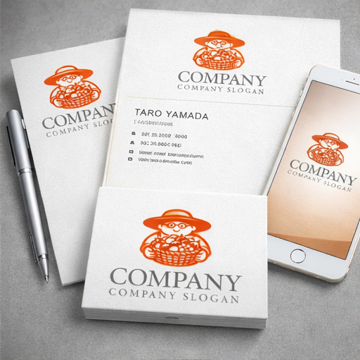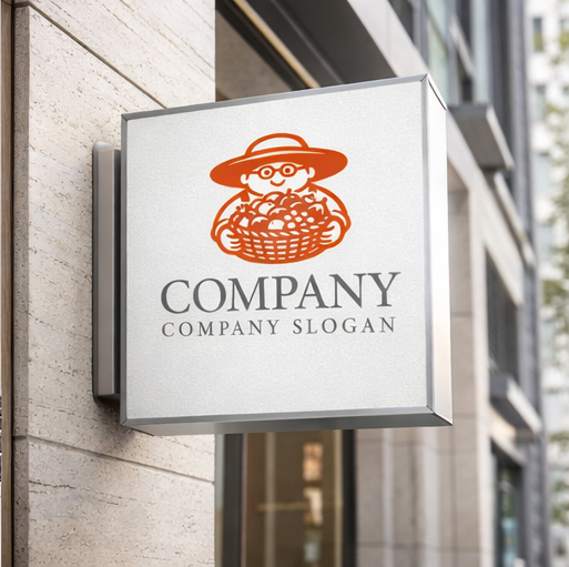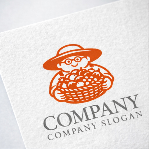 大きな帽子をかぶった農家さんが、収穫した野菜や果物がぎっしり詰まったバスケットを両手でしっかり抱えている様子を描いたロゴマークです。丸みのある線と明るいオレンジの色合いが、親しみやすさ・安心感・豊かさを感じさせ、直売所・農園ブランド・食品メーカー・マルシェイベントなど幅広い用途に最適です。キャラクター性が強く視認性も高いため、看板・パッケージ・Webサイト・ショップカードなど、どんな媒体でも印象に残るデザインです。