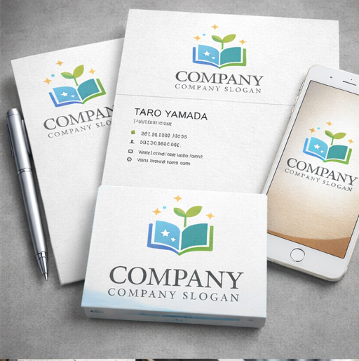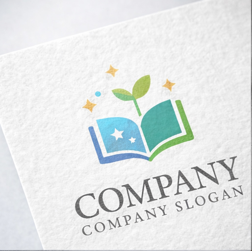開いた本から芽が伸びる様子をシンボルとして描いたロゴマークです。本は知識や教育、学びの広がりを表し、そこから芽吹くグリーンのリーフは成長・未来・可能性を象徴しています。ブルーとグリーンの爽やかな配色に加え、星のきらめきを添えることで、希望や夢、知識が輝く瞬間を表現したデザインです。教育サービス、学習塾、子ども向けスクール、オンライン学習プラットフォーム、出版関連ブランドなどにふさわしい、ポジティブで印象的な会社ロゴです。
