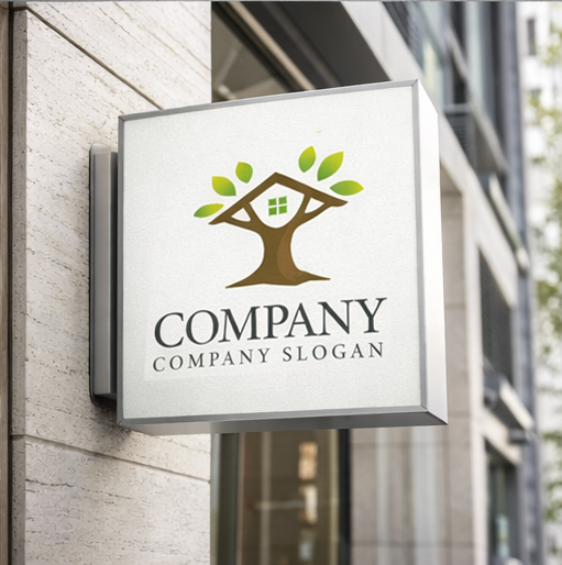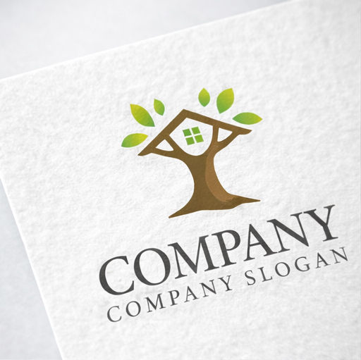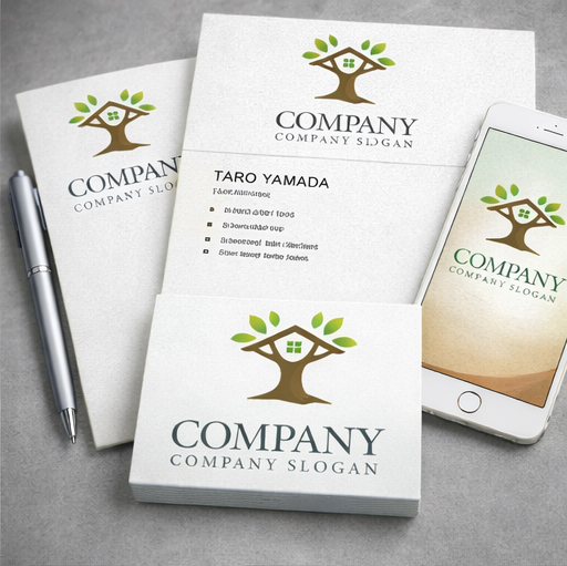 大きな木の幹と枝を家の形に見立てたデザインが特徴的なロゴマークです。力強い幹は安定した基盤や信頼を象徴し、屋根のように広がる枝と鮮やかなグリーンの葉が自然との共生や持続可能な暮らしを表現しています。中央の窓が住まいの温もりや安心感をさりげなく示し、住宅会社、不動産サービス、エコ住宅ブランド、リフォーム事業などにふさわしい会社ロゴです。シンプルで覚えやすい構成により、名刺や看板、ウェブサイトなど幅広い媒体でブランドの理念を印象的に伝えることができます。