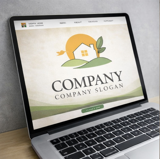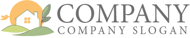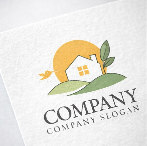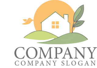 丘の上に建つ家と大きな太陽、そして葉と小鳥を組み合わせたロゴマークです。やわらかな色合いのグリーンとオレンジが自然の温もりや穏やかな暮らしを表現し、丘のラインが広がる大地や安心できる住環境を象徴しています。家のシルエットは家族の安心や生活の中心を表し、小鳥や葉のモチーフが自然との共生や希望の未来を感じさせるデザインです。住宅ブランド、不動産サービス、エコ住宅、ライフスタイル関連の会社ロゴとして、温かく親しみやすい印象を与えるロゴマークです。