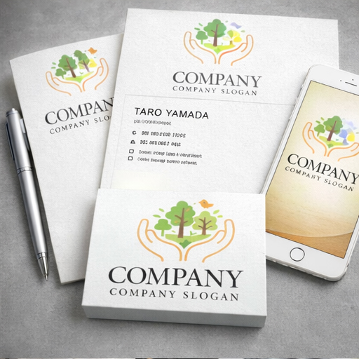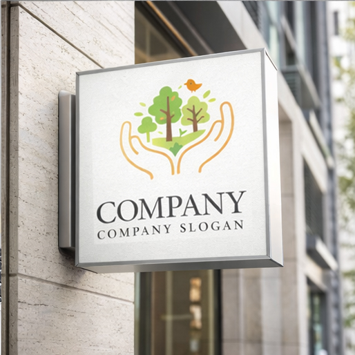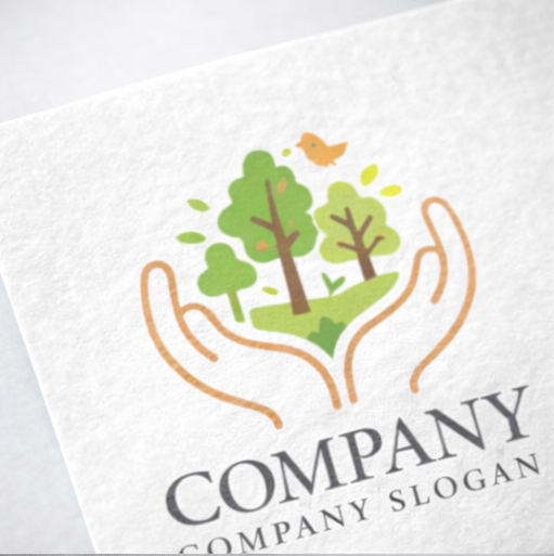 「自然をやさしく守るエコシンボルマーク」 両手で森を包み込むように描いたデザインが印象的なシンボルマークです。手のモチーフは「守る」「支える」「育てる」という意味を表し、その中にある木々と小鳥が自然の豊かさや生命のつながりを象徴しています。やわらかなグリーンとオレンジの配色が安心感と温かさを生み出し、環境保護団体、エコプロジェクト、サステナブルブランド、自然教育サービスなどにふさわしい会社ロゴです。自然と人が共に生きる未来をイメージした、やさしくポジティブな印象を与えるロゴマークです。