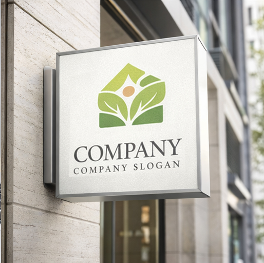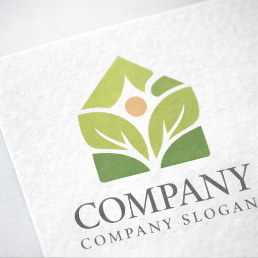 「自然と調和するライフスタイルロゴマーク」 家のシルエットと葉のモチーフ、そして中央の丸い太陽を組み合わせたロゴマークです。家の形は安心できる住まいや暮らしの拠点を象徴し、その中に広がる葉のデザインが自然との共生や持続可能なライフスタイルを表現しています。中心の太陽は希望や成長、明るい未来を意味し、グリーンのグラデーションが環境へのやさしさや調和を感じさせます。住宅ブランド、エコ住宅、不動産サービス、サステナブル事業などにふさわしい会社ロゴとして、温かく前向きな印象を与えるデザインです。