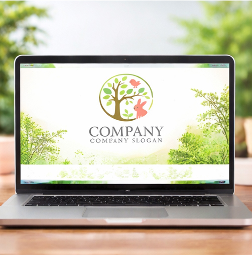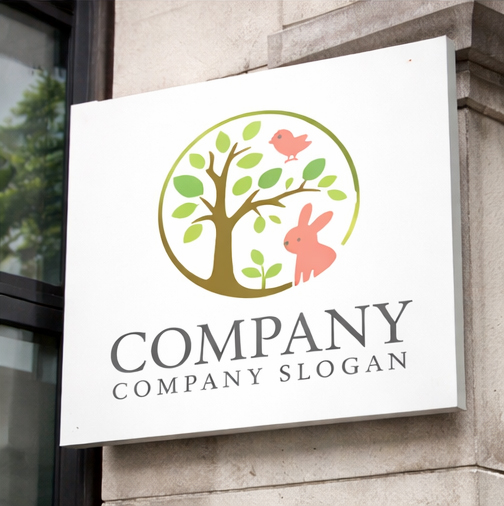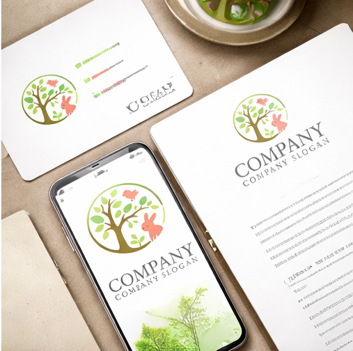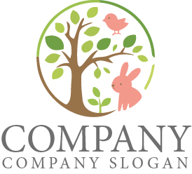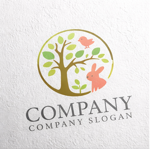「森のやさしい物語を描くアニマルロゴマーク」 大きな木を中心に、小鳥とウサギを組み合わせた温かみのあるロゴマークです。豊かな葉を広げる木は自然の成長や生命の循環を象徴し、その周りにいる小鳥とウサギが穏やかな自然の世界や共生のイメージを表現しています。グリーンとブラウンを基調に、やわらかなピンクをアクセントにした配色が優しさと親しみやすさを生み出し、ナチュラルブランド、子ども向けサービス、自然教育、エコプロジェクトなどにぴったりの会社ロゴです。見る人に安心感と自然の温もりを届ける、物語性のあるロゴマークです。